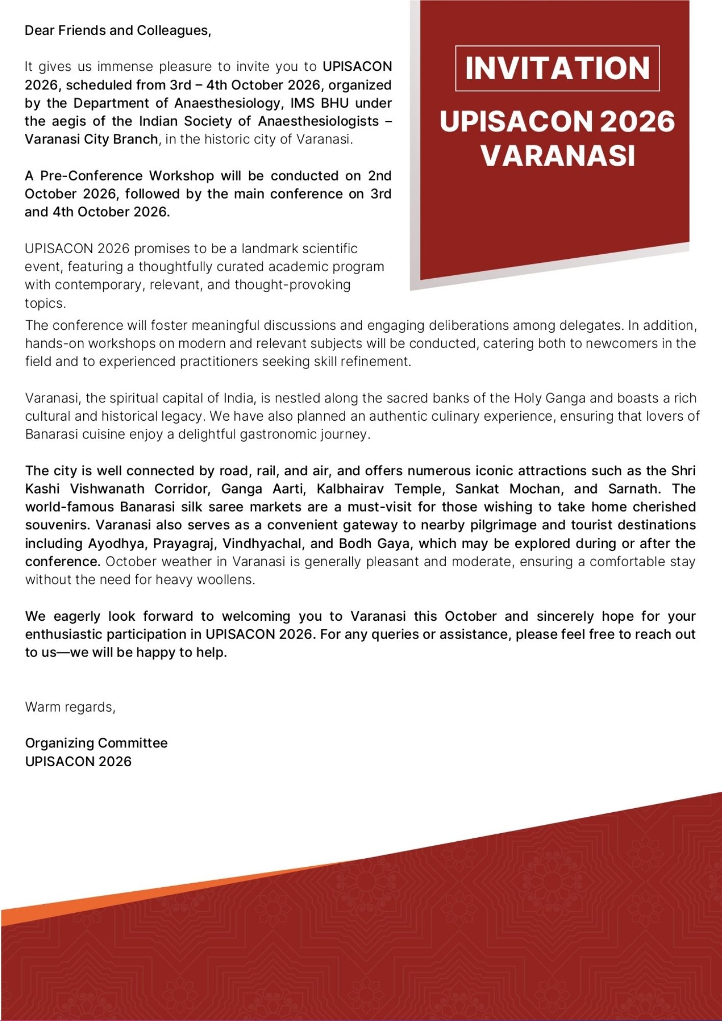 Description - Good afternoon, members of ISA! The executive committee of ISA Uttar Pradesh is pleased to announce the dates for the 48th UPISACON 2026, to be held in Varanasi from 2nd to 4th October 2026. Please join the academic event and be a part of the UPISACON 2026.