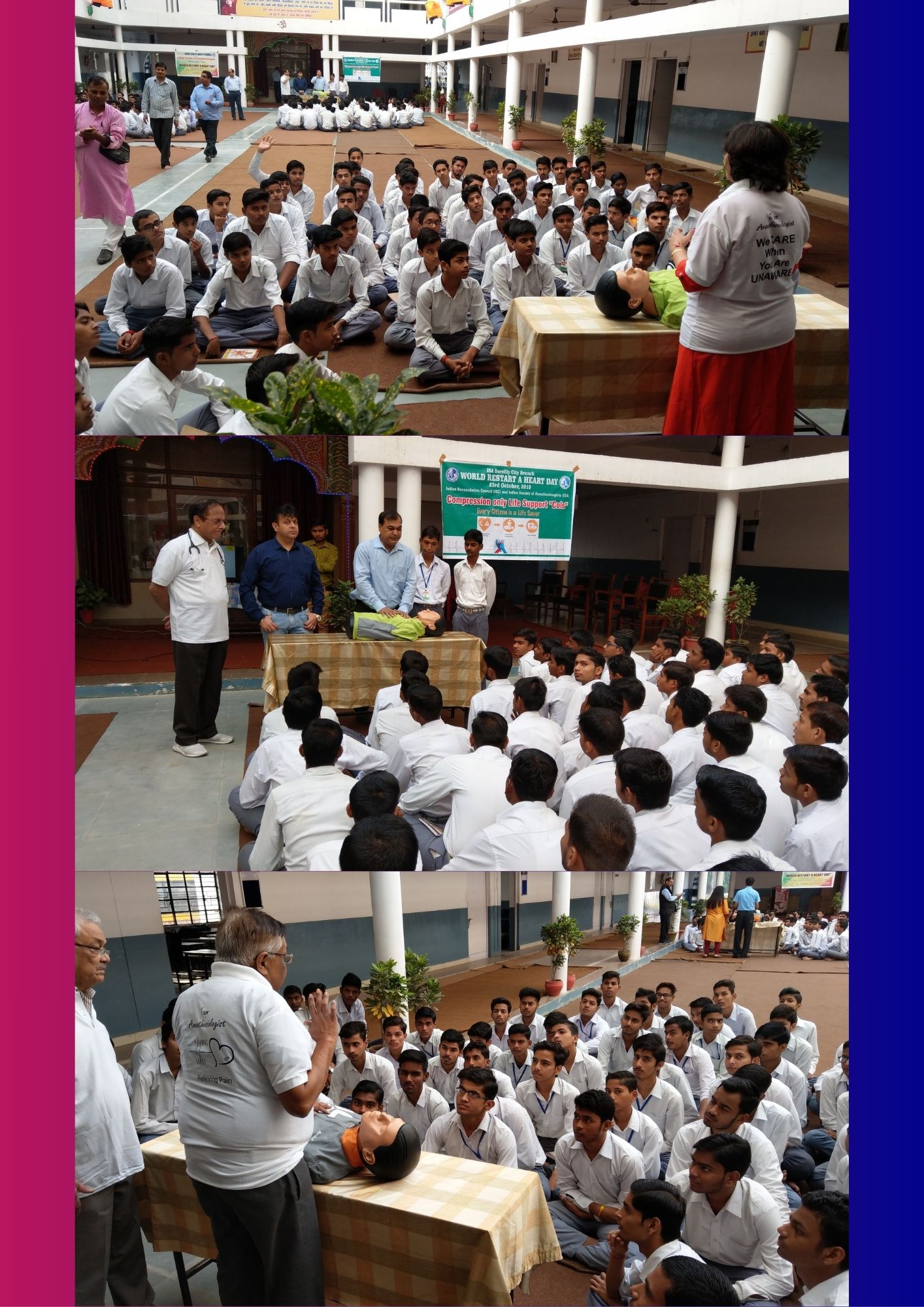 Description - Public awareness CPR hands on Workshops at Administration Bareilly, Police line, Rotary clubs, Parks, Different Schools including Boarding school of Nainital- St. Joseph's & All Saints College Nainital.